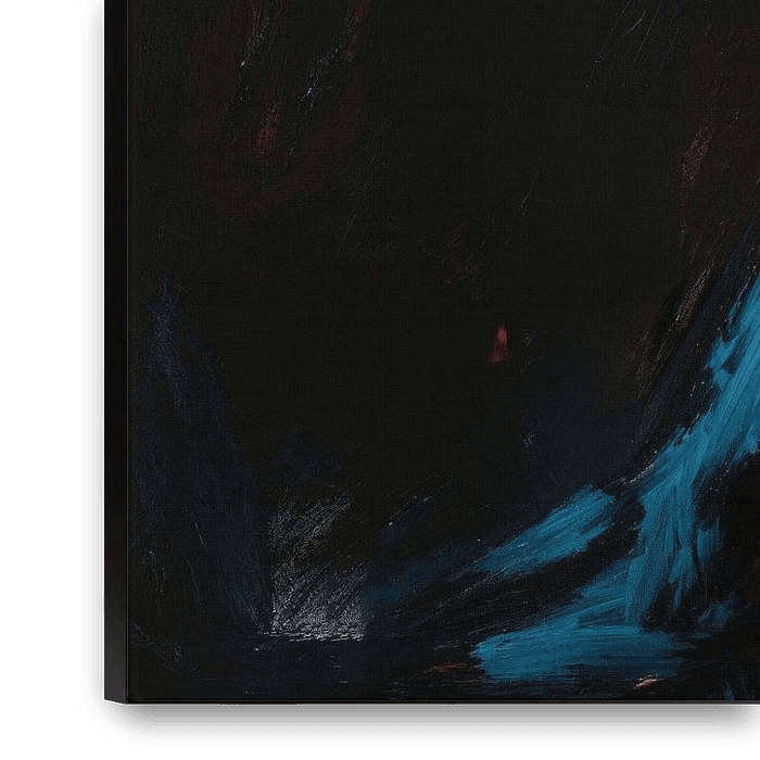 Dressed in deep shades of blue, a pensive figure rests in contrast to glowing reds, reflecting emotions and inner struggles. This powerful composition lends an intense atmosphere to any room and would be particularly impressive in the living room, where it can inspire reflection and dialogue.
