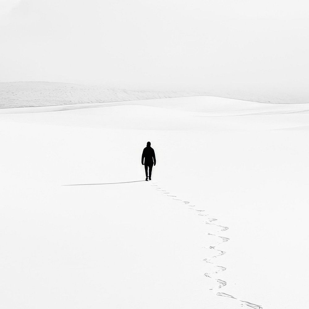 In this impressive black and white depiction, a solitary figure wanders through an endless, snow-covered landscape. The shimmering, white expanse is interrupted only by the narrow path of footprints that documents her silent journey. The picture radiates a deep melancholy and emphasises the loneliness and infinity of nature.