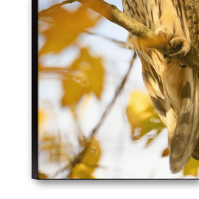 Buy this bird art Long-eared owl sitting high up in a tree with yellow leafs by Sjoerd van der Wal Photography on canvas, ArtFrame, poster and wallpaper, printed on demand in high quality.