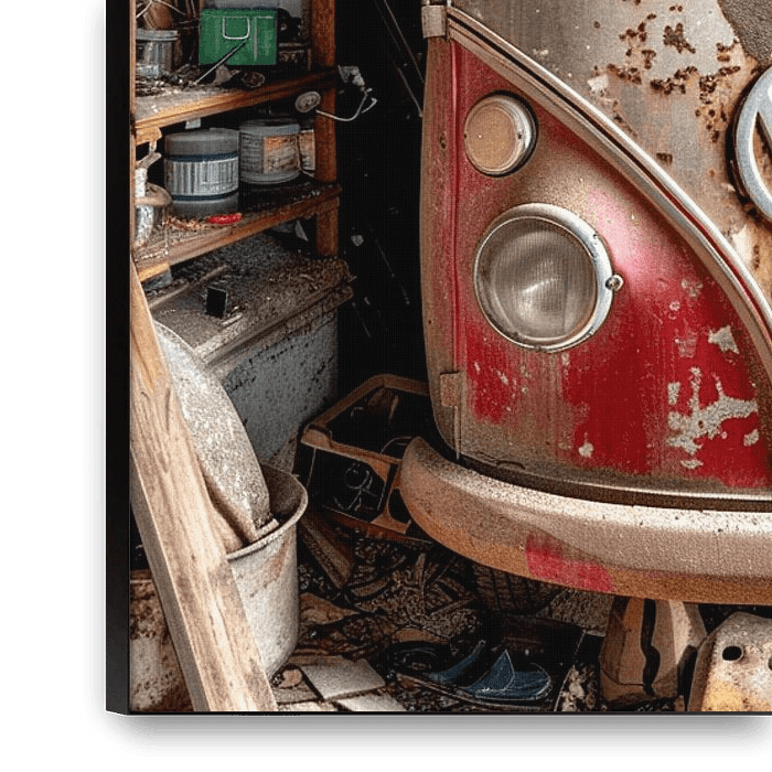 This captivating image shows a rusty VW Bulli that has come to rest in a state of quiet decay in a chaotic, abandoned barn or garage. The once bright red and white paintwork of the iconic bus is now marked by deep rust stains and chipping, giving it a rich, lived-in patina. Old suitcases, symbols of past journeys and countless…