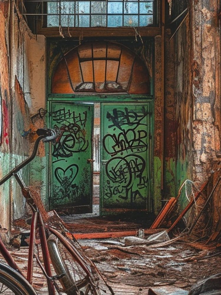 A deserted corridor, its walls covered in graffiti, leads the eye to a green double door at the end. A rusty old bicycle leans against the left-hand wall. Natural light falls through high windows on the right, illuminating the dusty floor and the remains of destruction. The atmosphere is characterised by decay and silence, the traces of the past are omnipresent. The colour palette is earthy, with accents of rust red, green and the colourful graffiti tags.