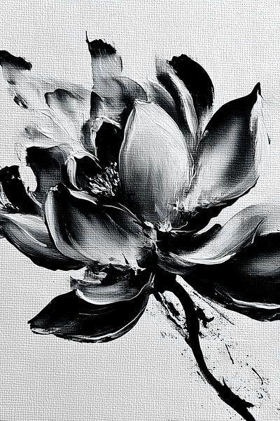 A vertical, high-contrast painting of a blooming lotus. The petals are defined by thick, impasto-style black and white paint, set against a stark, canvas-textured white background.