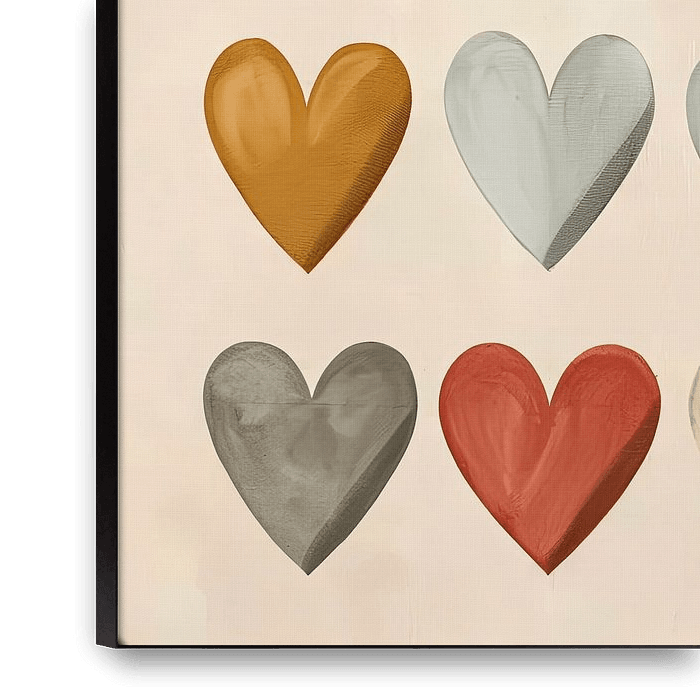 This artwork shows 12 hearts, arranged in a grid of four rows and three columns. Each heart has a soft, fabric texture and is rendered in a variety of colours, including red, yellow, pink, grey and black. The hearts are placed on a light, neutral background, contributing to a serene and balanced look.