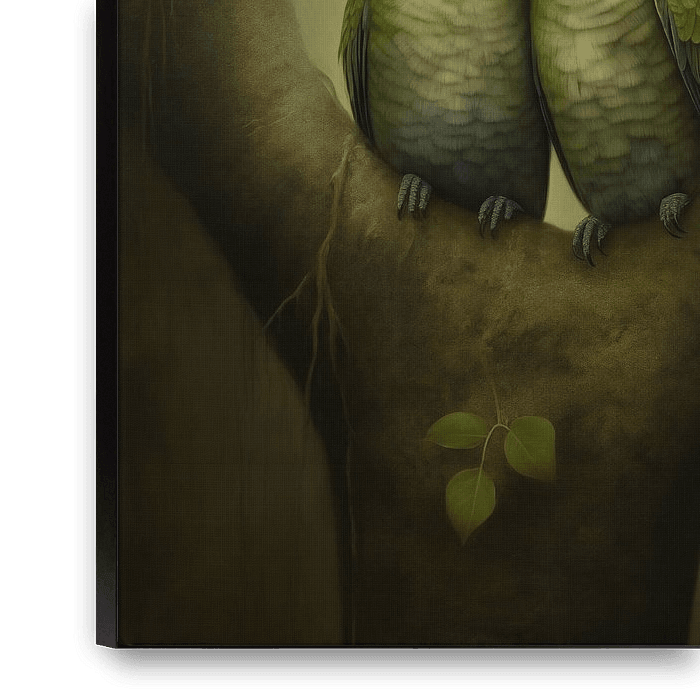 Two colourful lovebirds sit close together in the hollow of a tree shaped like a heart. The warm hues of their plumage and the soft glow of the forest give this artwork a romantic and dreamy feel. A symbol of connection and love in nature.