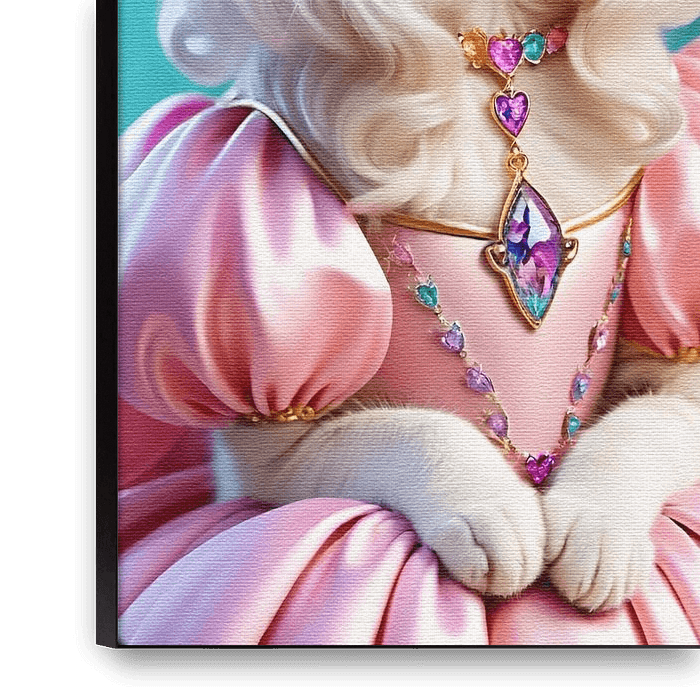 The cat po(e)ses like a true queen, dressed in a beautiful shiny pink dress, complete with precious stone necklaces and a crown on her head.
