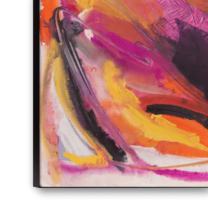 The friendly yellow tones bring a sunny and happy look, while the vibrant oranges add warmth and energy. The powerful black provides a wonderful counterbalance in this turbulent colour storm, keeping the painting's dynamic character, yet creating calm.