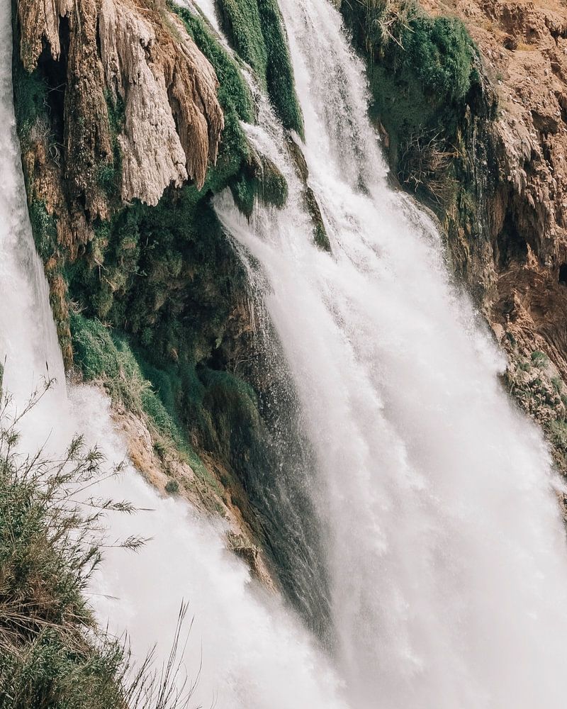 The photo shows the Lower Düden Waterfall, the most famous waterfall in Antalya, Turkey. It is a gigantic waterfall where liters of water fall violently into the sea.