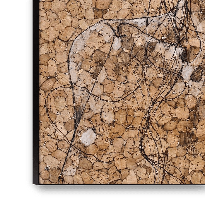 A figurative abstract work of black thread, charcoal & chalk on cork.