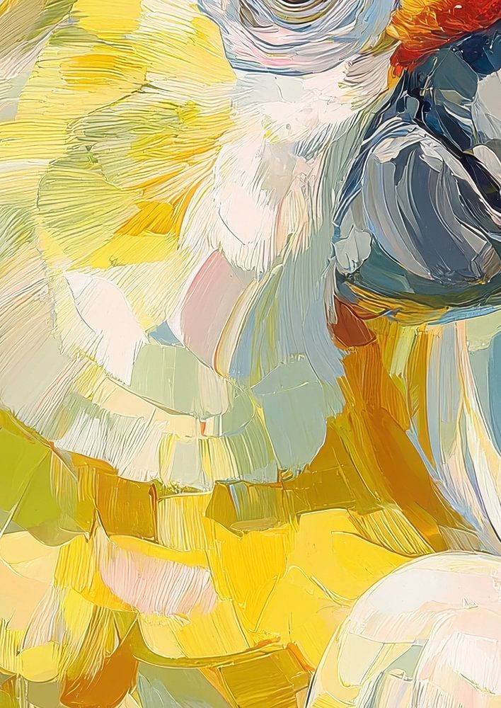 This oil painting shows a bright yellow cockatoo in vivid detail. Expressive brushstrokes and the use of the palette knife technique create a rough texture with a strong impasto effect. Bright colours, soft light and gentle shadows lend the motif a fascinating depth. The abstract background play reinforces the contrast between form and surroundings, while tropical vegetation emphasises the exotic mood. In the close-up with a bird's eye view, thick lines and sweeping curves combine to create a powerful yet harmonious composition. The work combines energy and elegance and emphasises the beauty of the tropical bird in a modern, expressive way.