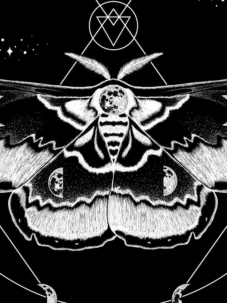 This black-and-white artwork depicts a symmetrical moth surrounded by geometric shapes and moon phases. The moth is central as a symbol of transformation, intuition and following inner rhythms. The different phases of the moon are incorporated around and in the pattern of the wings, emphasising the cyclical nature of the…