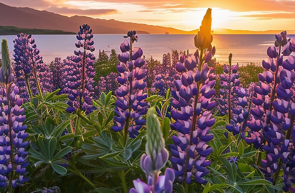 Buy this landscape artwork Lupins at sunset by fernlichtsicht on canvas, ArtFrame, poster and wallpaper, printed on demand in high quality.
