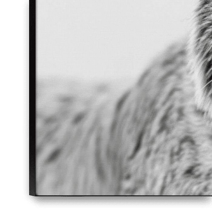 This fascinating black and white portrait of a lynx captivates with its mysterious aura and the animal's sharp features. The high-contrast details and the intense presence of the lynx cast a spell over the viewer. Perfect for nature lovers and photo art enthusiasts, this artwork brings a mystical yet elegant atmosphere into your home.
