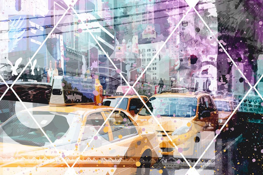 A modern and decorative New York City composing. A typical Manhattan street scene at Times Square and Brooklyn Bridge surroundings. Extravagant impression in a geometric shape with coordinates.