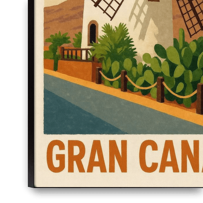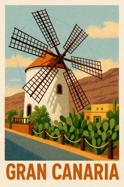 A traditional windmill tower with a red roof and white walls is at the centre of this travel poster. Surrounded by green vegetation, cacti and a yellow building, the motif conveys a rural idyll and cultural heritage. The windmill in Mogan is a symbol of the history of Gran Canaria and appeals to all those who are enthusiastic about…