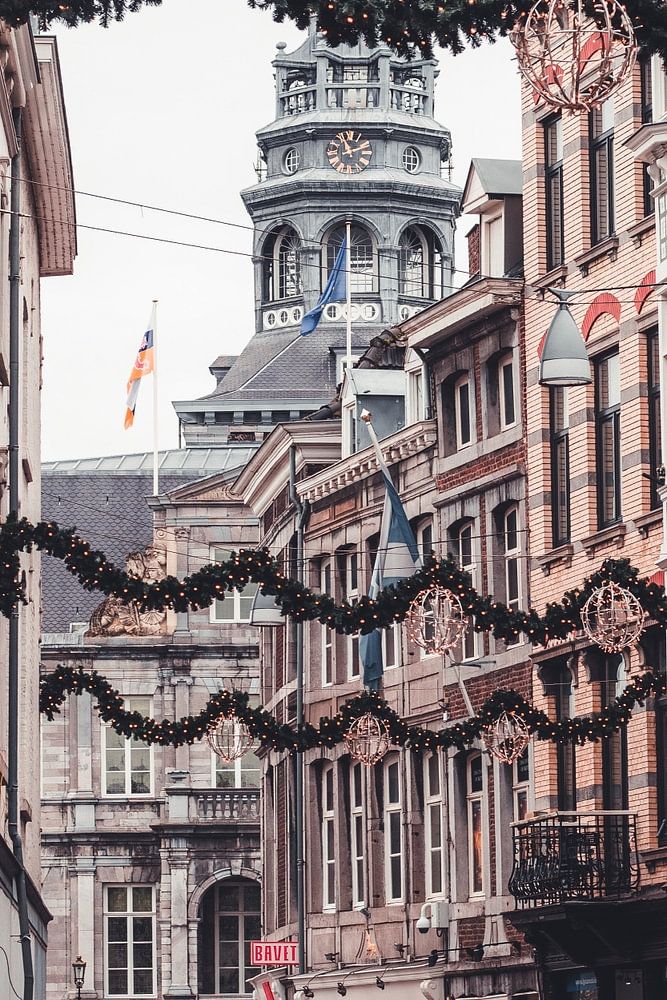 The Grote Gracht in Maastricht with Christmas lights and a view of the City Hall. January 2021