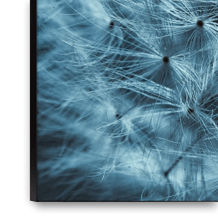 Buy this flower art Macro dandelion flying seed abstract in cool blue by Dieter Walther on canvas, ArtFrame, poster and wallpaper, printed on demand in high quality.