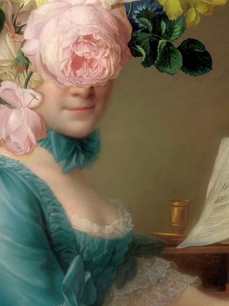 In 2022, I created (with great respect and reverence) this version of the portrait using Photoshop. Madame Favart's face is now hidden behind an exuberant hairdo of flowers.