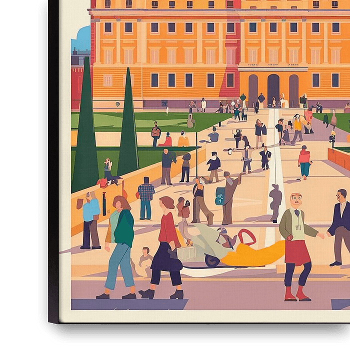 Amidst the hustle and bustle, the majestic architecture of the royal palace stands out, surrounded by lush green trees and a bright blue sky. People enjoy a sunny day while the colourful scenery captures the vibrant charm of Madrid - a place where history meets culture.