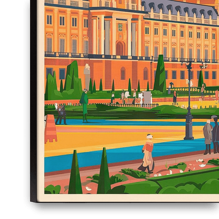 The radiant colours and magnificent, symmetrical shapes of the royal palace capture the majestic beauty of Madrid. The elegant gardens with carefully trimmed hedges and blooming flowers invite you to take a stroll, while the clear, bright blue sky emphasises the romantic atmosphere of the city. Madrid - a place where history and art…