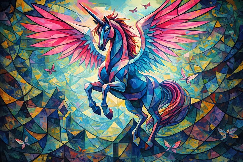 A colourful unicorn with pink and blue wings flies gracefully through a background of geometric shapes. Small butterflies accentuate the vibrant scene.