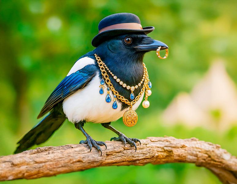 A photorealistic magpie sits proudly in a garden, draped in rings, necklaces, and a hat, even holding a gemstone in its beak. A playful visual for the saying “a thieving magpie.”