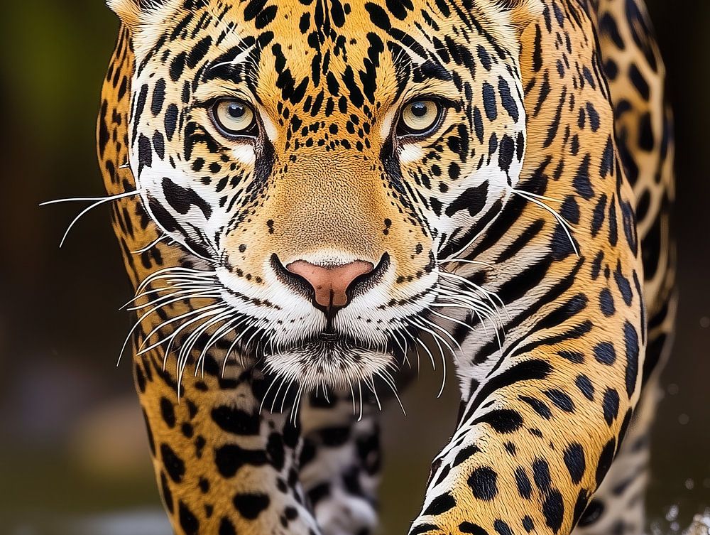 This stunning illustration features a majestic jaguar gracefully walking through shallow water, embodying both power and elegance. The jaguar’s sleek, muscular body is rendered with exquisite detail, from the intricate patterns of its golden-yellow coat adorned with bold, black rosettes to the tension in its powerful limbs as it moves silently through its environment. The water ripples around its paws, capturing the momentary disturbance in the otherwise calm surface, reflecting the surrounding lush jungle in soft hues of green and blue. The jaguar’s focused expression, with sharp, intense eyes, conveys a sense of determination and awareness, as if it is stalking unseen prey or navigating its territory with unmatched precision. The play of light and shadow across the scene enhances the sense of depth and realism, with beams of sunlight piercing through the dense foliage overhead. The atmosphere is one of quiet intensity, where the jaguar’s presence dominates the scene, showcasing the grace and raw power of one of the wild’s most formidable predators.