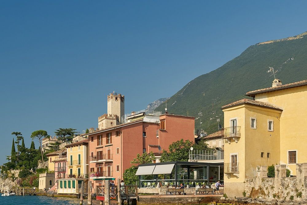 View of the town of Malcesine on Lake Garda in Italy, popular with tourists from all over the world, photographed from the water during a boat trip to one of the neighbouring towns
