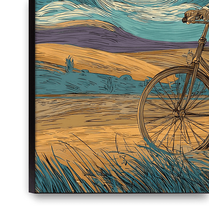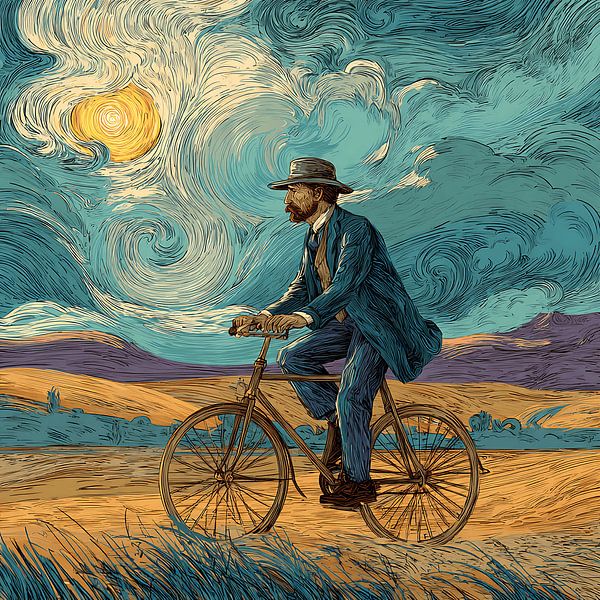 Buy this digital art artwork Man Cycling Across Starry Night by Aden Pink Studio as a reproduction on canvas, ArtFrame, poster and wallpaper, printed on demand in high quality.