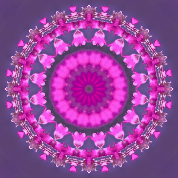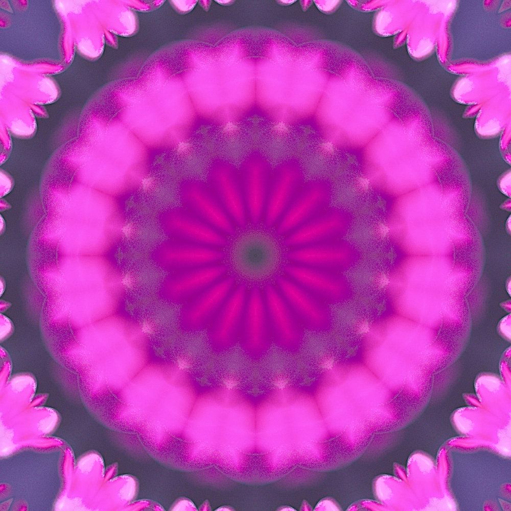 Mandala in powerful colours, predominantly purple and pink, created from a real image.