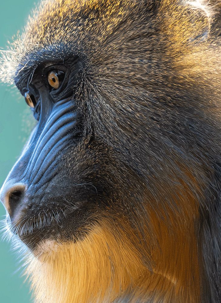 This stunning close-up of a mandrill (Mandrillus sphinx) captures the beauty and intelligence of one of nature's most striking primates. Mandrils, native to the dense rainforests of central Africa, are known for their vivid facial markings and social behaviour. Their colourful fur and expressive eyes make them a fascinating subject for wildlife photography.