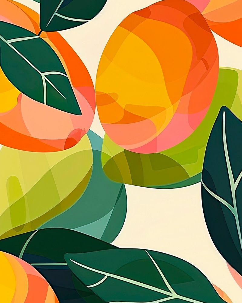 In this illustration, the mango's and leaves are stylised, creating a mosaic of colour and shape.