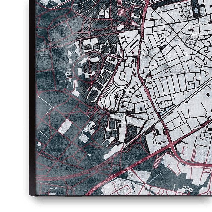 This map of Apeldoorn centrum has our custom made style "White winter". The dark red streets form warm veins in the cold snow covered landscape. While the vegetation is preparing itself leafless for the coming spring. This wintery map of Apeldoorn centrum will give your interior a refreshing look.
