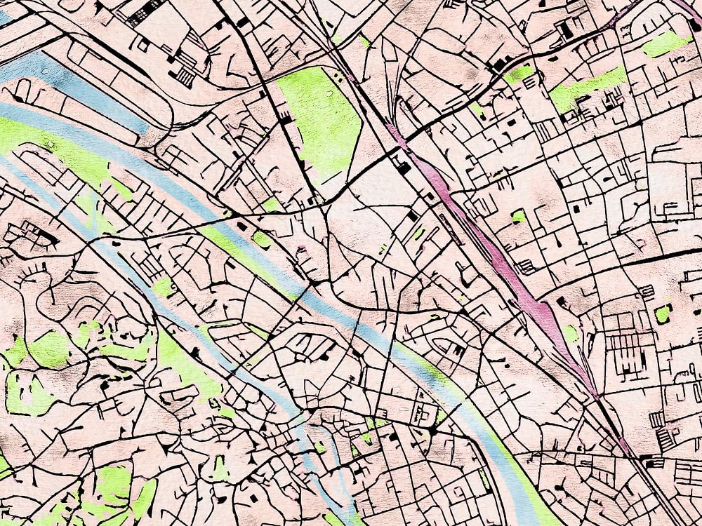 This map of Bamberg has our custom style “Soothing Spring”. This style is inspired by Japanese drawings of colorful cherry blossoms. With its vibrant colours, this map of Bamberg will bring your room to life.