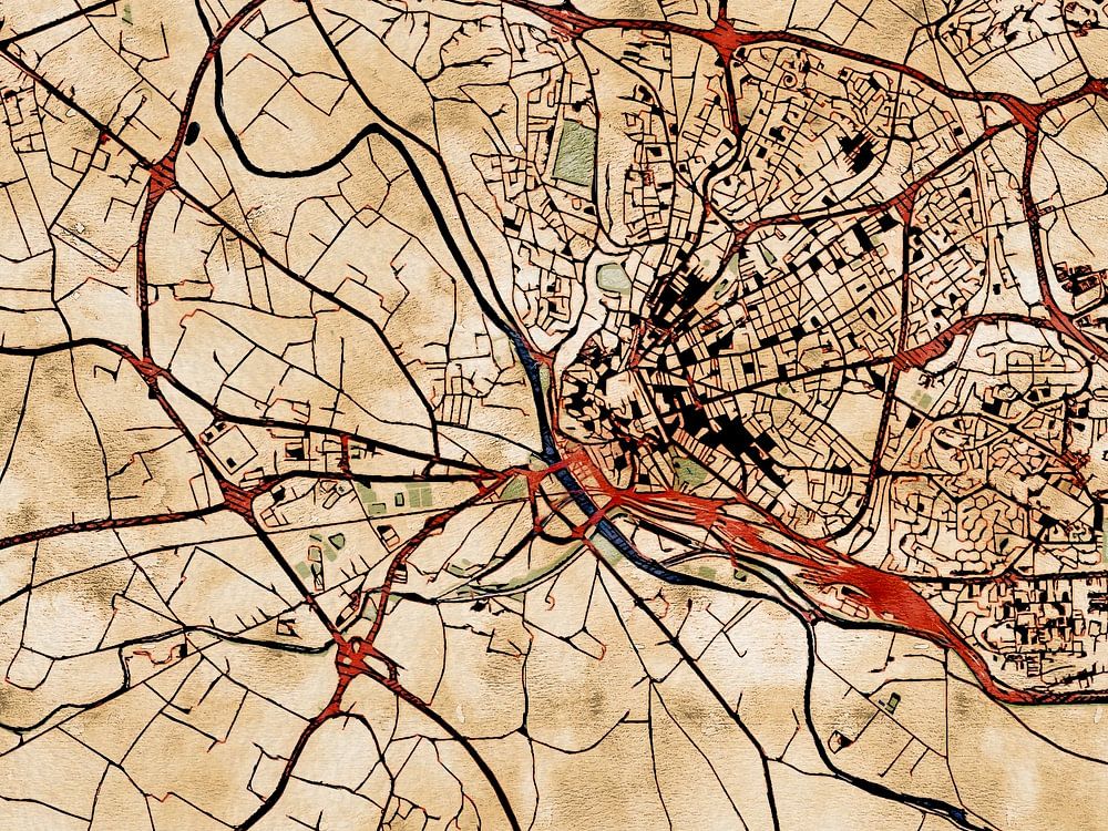 This map of Béziers features our custom style “Serene Summer”. This style is characterised by the warm, sun-drenched earthy tones. The color palette is inspired by the Art Nouveau style of the turn of the century. This map of Béziers gives your interior a classic, modern look.