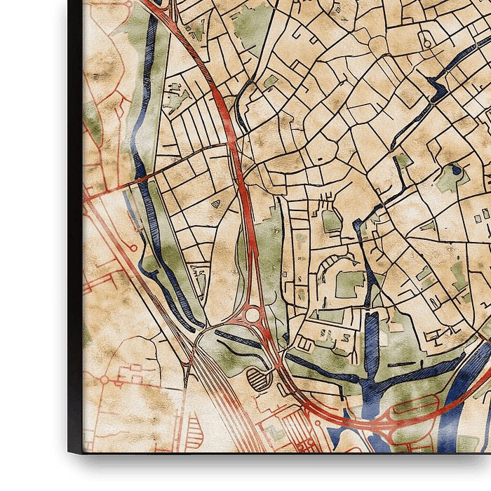 This map of Brugge centrum features our custom style “Serene Summer”. This style is characterised by the warm, sun-drenched earthy tones. The color palette is inspired by the Art Nouveau style of the turn of the century. This map of Brugge centrum gives your interior a classic, modern look.