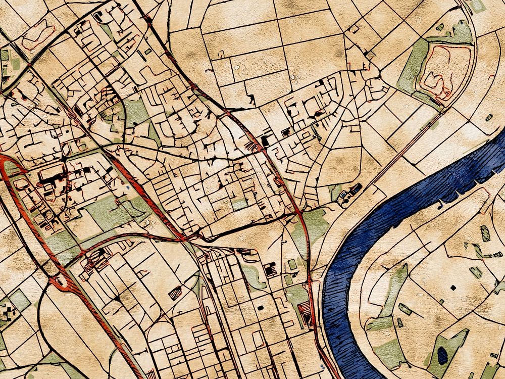 This map of Dormagen features our custom style “Serene Summer”. This style is characterised by the warm, sun-drenched earthy tones. The color palette is inspired by the Art Nouveau style of the turn of the century. This map of Dormagen gives your interior a classic, modern look.