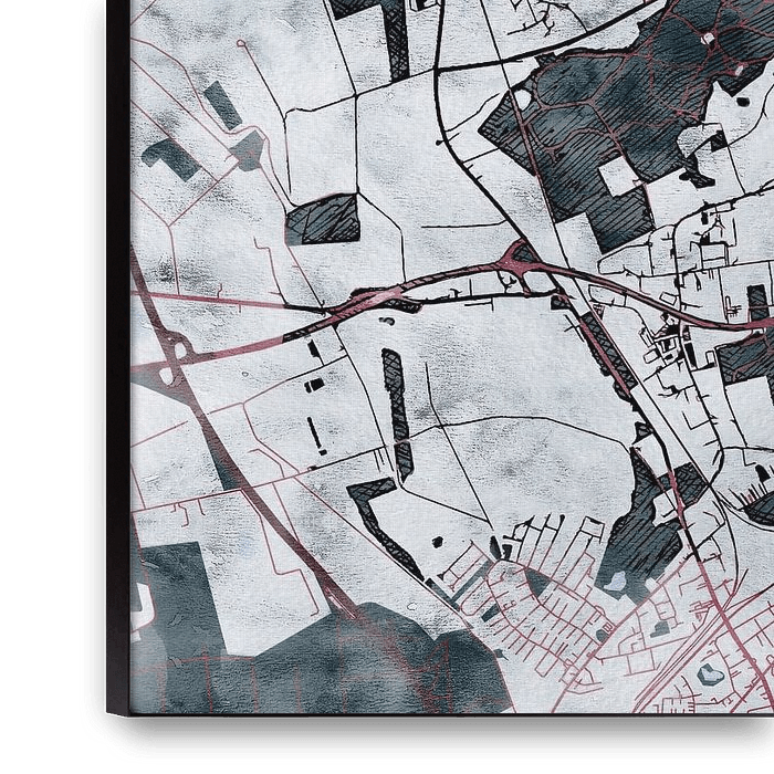 This map of Flensburg has our custom made style "White winter". The dark red streets form warm veins in the cold snow covered landscape. While the vegetation is preparing itself leafless for the coming spring. This wintery map of Flensburg will give your interior a refreshing look.
