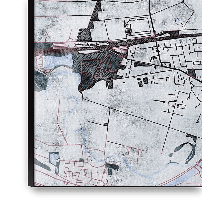 This map of Garbsen has our custom made style "White winter". The dark red streets form warm veins in the cold snow covered landscape. While the vegetation is preparing itself leafless for the coming spring. This wintery map of Garbsen will give your interior a refreshing look.