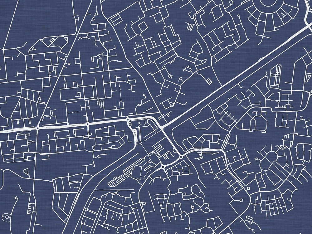 Explore Hellevoetsluis with this map in the Royal Blue style. The white roads contrast against a deep blue background. Combined with a subtle linen texture, this map adds a touch of refinement and tranquility to any space where it is displayed.