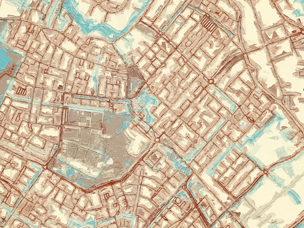 We hereby present a map of Hendrik-Ido-Ambacht in the Blue & Creme style. This digital painting showcases a cream background, symbolizing tranquility, while the light blue hues depict the waterways and the vibrant red roads accentuate the city streets.