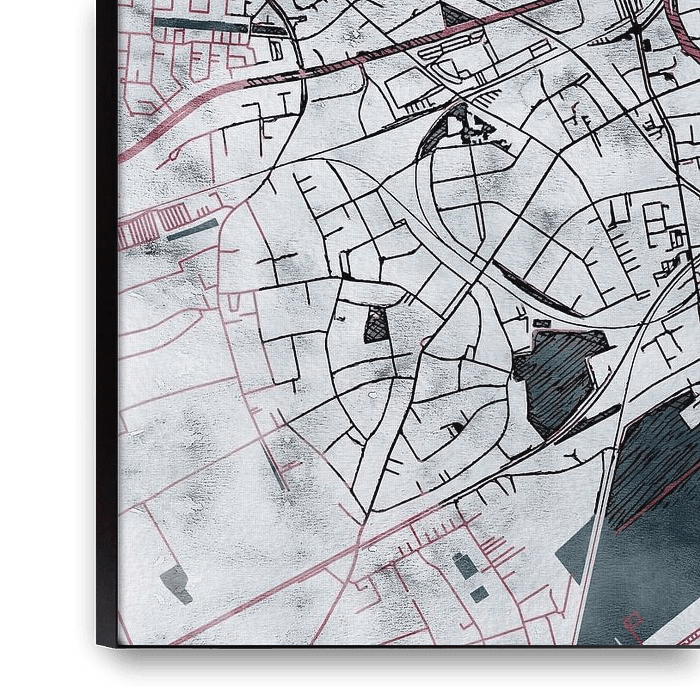 This map of Krefeld has our custom made style "White winter". The dark red streets form warm veins in the cold snow covered landscape. While the vegetation is preparing itself leafless for the coming spring. This wintery map of Krefeld will give your interior a refreshing look.