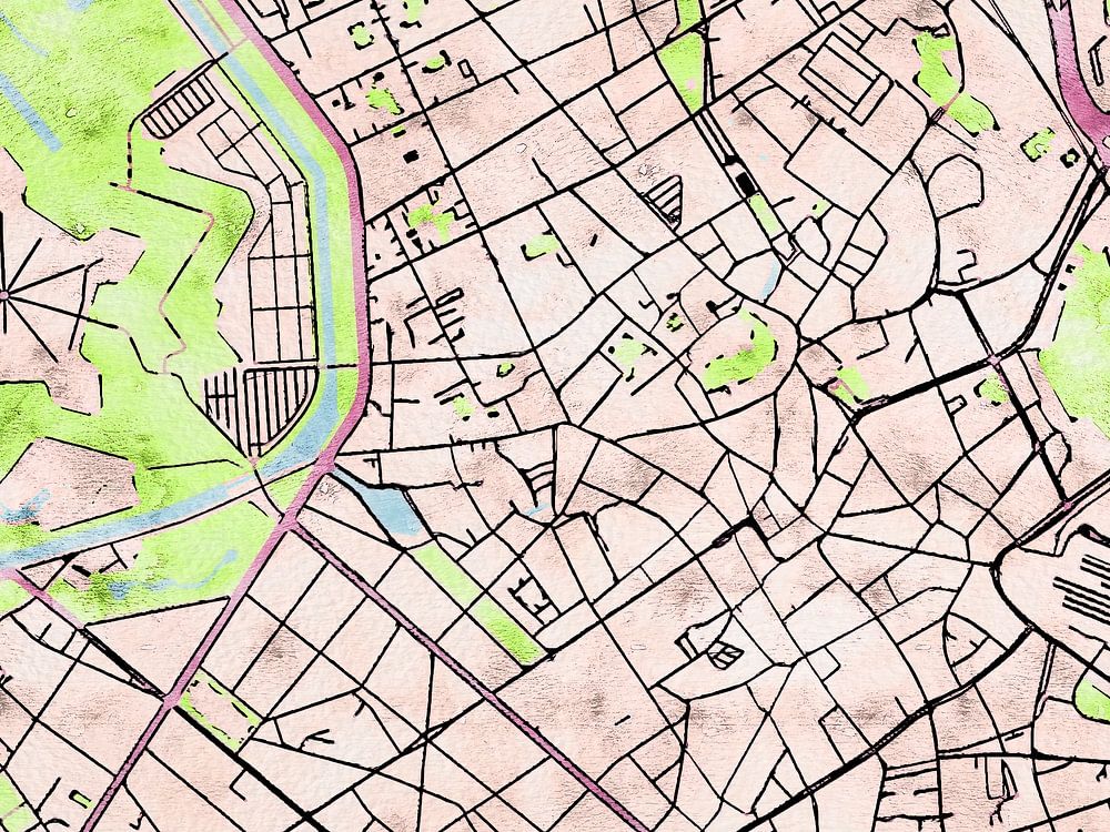 This map of Lille centrum has our custom style “Soothing Spring”. This style is inspired by Japanese drawings of colorful cherry blossoms. With its vibrant colours, this map of Lille centrum will bring your room to life.