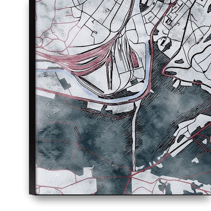 This map of Namen has our custom made style "White winter". The dark red streets form warm veins in the cold snow covered landscape. While the vegetation is preparing itself leafless for the coming spring. This wintery map of Namen will give your interior a refreshing look.