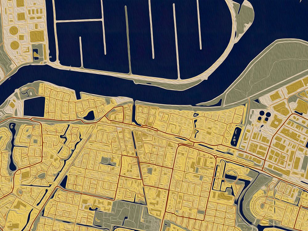 This map of Oud-Beijerland was inspired by the colour palette of Gustav Klimt's painting 'The Kiss'. The dark blue and orange tones give this map of Oud-Beijerland an art deco look.