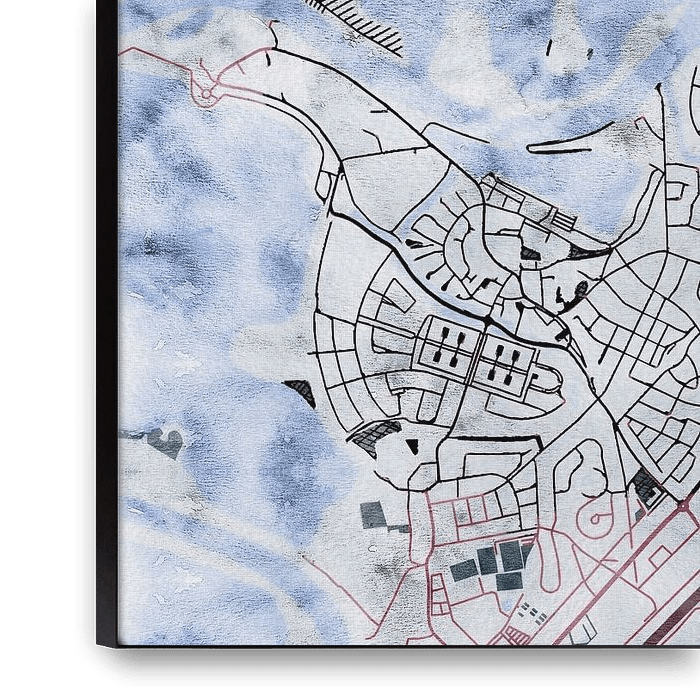 This map of Roermond has our custom made style "White winter". The dark red streets form warm veins in the cold snow covered landscape. While the vegetation is preparing itself leafless for the coming spring. This wintery map of Roermond will give your interior a refreshing look.
