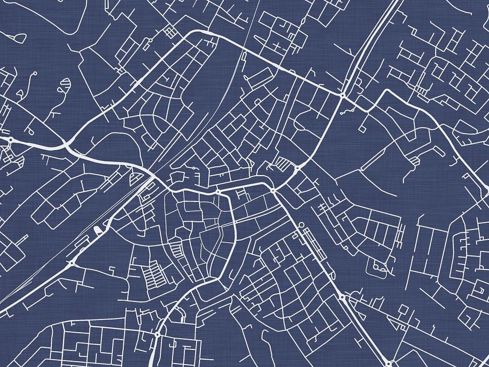 Explore Sneek with this map in the Royal Blue style. The white roads contrast against a deep blue background. Combined with a subtle linen texture, this map adds a touch of refinement and tranquility to any space where it is displayed.