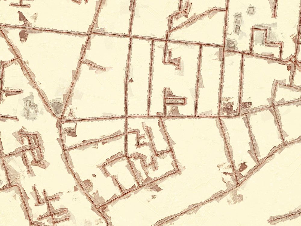 We hereby present a map of Tilburg Centrum in the Blue & Creme style. This digital painting showcases a cream background, symbolizing tranquility, while the light blue hues depict the waterways and the vibrant red roads accentuate the city streets.
