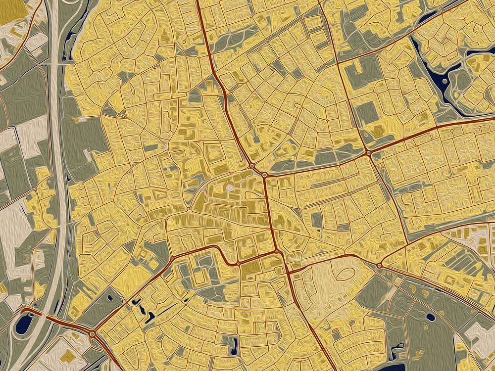 This map of Uden was inspired by the color palette of the painting 'The Kiss' by Gustav Klimt. The dark blue and orange tones give this map of Uden an art deco look.