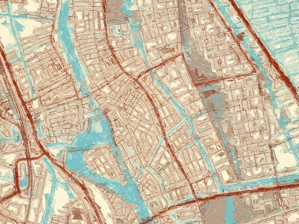 We hereby present a map of Zaandam in the Blue & Creme style. This digital painting showcases a cream background, symbolizing tranquility, while the light blue hues depict the waterways and the vibrant red roads accentuate the city streets.