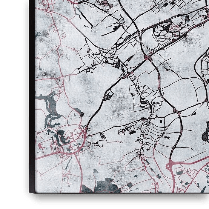 This map of Zwickau has our custom made style "White winter". The dark red streets form warm veins in the cold snow covered landscape. While the vegetation is preparing itself leafless for the coming spring. This wintery map of Zwickau will give your interior a refreshing look.